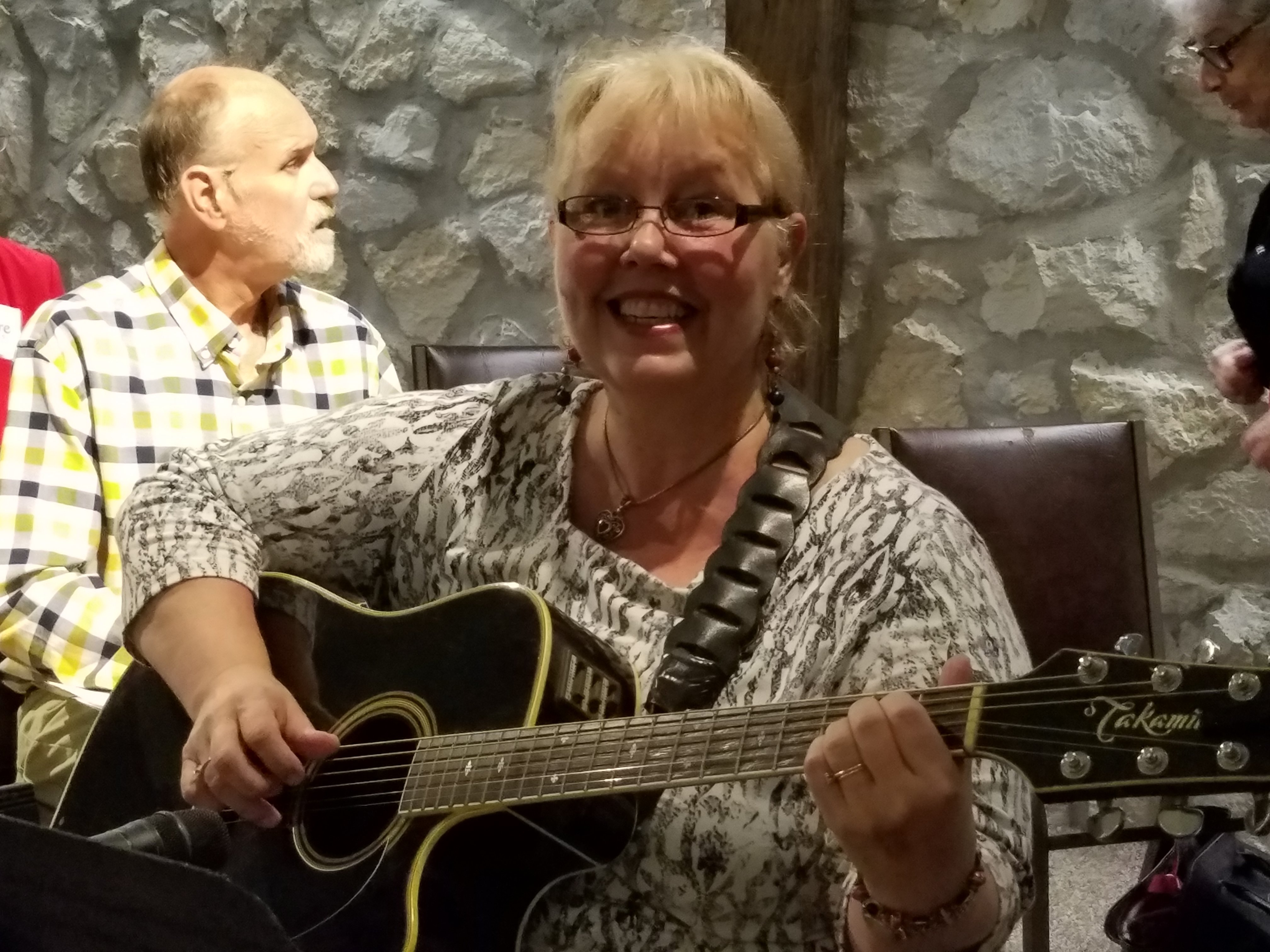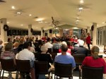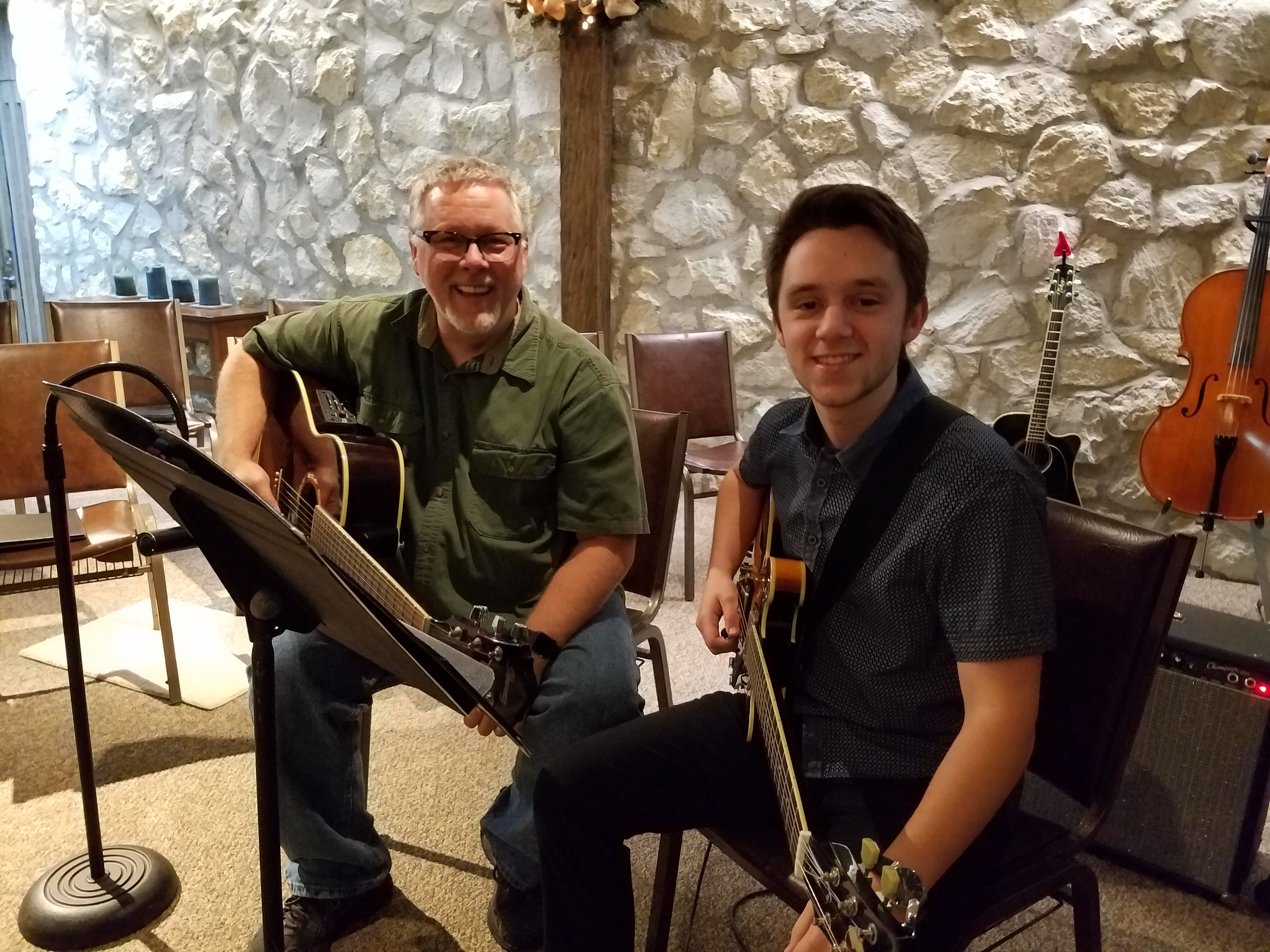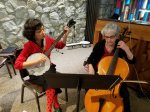 soloists & duos from the pre-service concert, left to right: Denise Williams, voice/guitar; Yoko Nogami, banjo & Margaret Radens, cello; Jim Andrews and his son, Zach Blair-Andrews, guitars.
