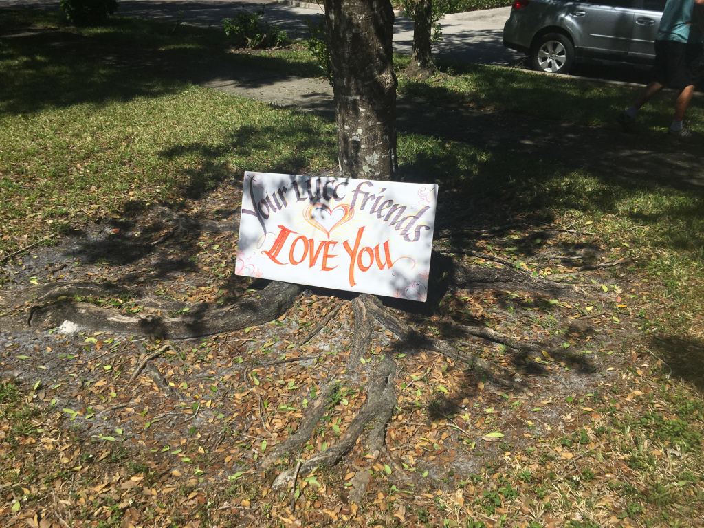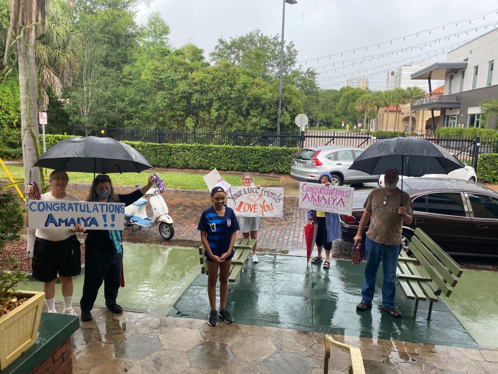 Last Sunday afternoon the care team set out on another caravan to bring greetings, joy, and love to LUCC members. This time the team, along with Ed Kasper, drove their cars to the homes of Olivia and Amaiya where they greeted the families, from the sidewalk, with personalized cheers of celebration and thanksgiving. Amayia was celebrated for completing 8th grade and now preparing to attend Lakewood High School. Olivia was thanked for her tireless work, devotion, and care as a nurse on the Covid unit at TGH. The rain did not dampen the spirits or the personally designed posters (thanks to Ruth!) presented to both Olivia and Amayia. It was a joyous experience for all, including a few neighbors standing by!