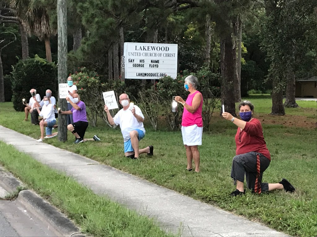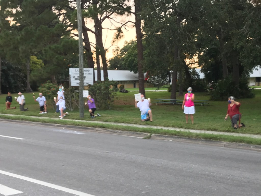 In response to the City’s request to honor the life of George Floyd at 8:00 p.m. for 8 minutes and 46 seconds for 8 nights, LUCC has had a vigil each night in front of the church sign which reads, “Say his name – George Floyd.” People from the church have come each night, taking the knee and shining a light, to call attention to racism and police brutality.
