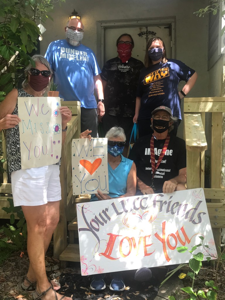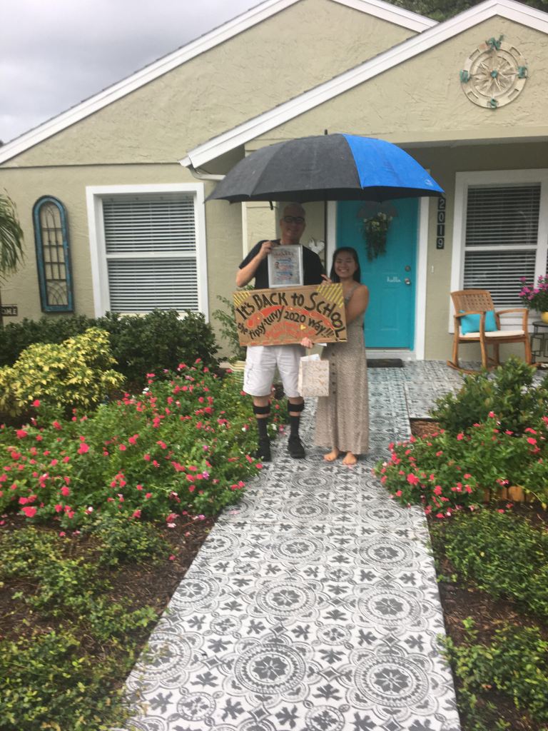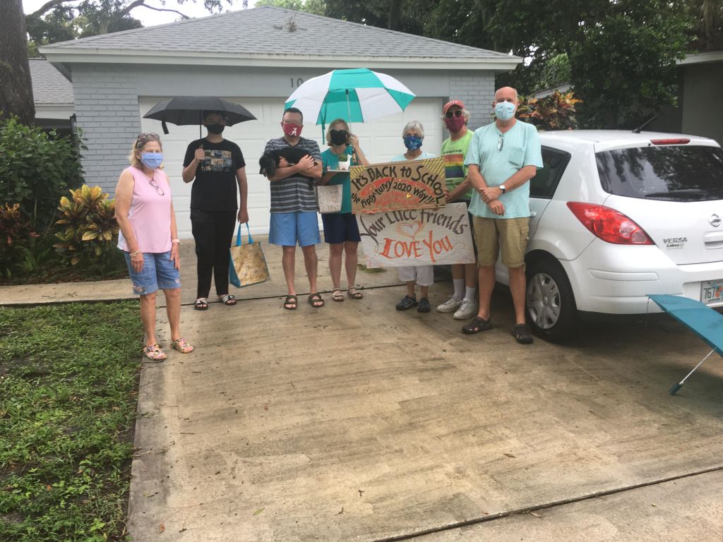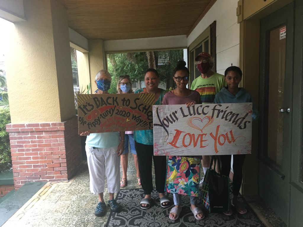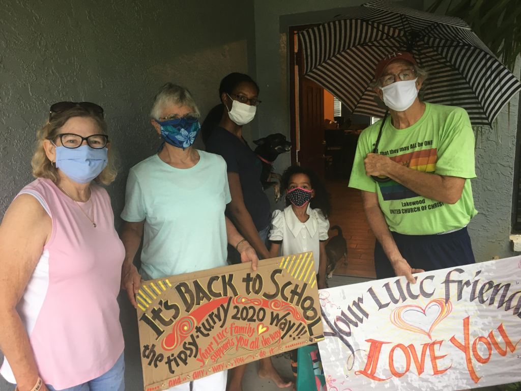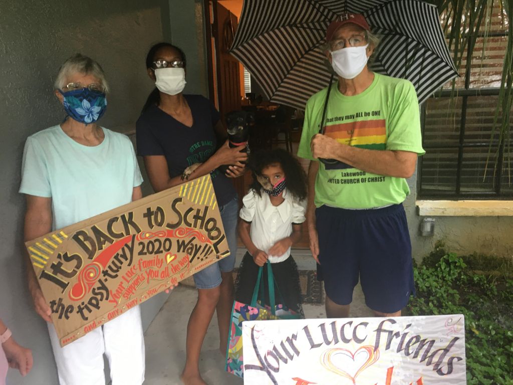 This back to school sign slogan created by Ruth Pettis became the theme of the Sunday and Tuesday LUCC back to school drive-by celebrations for LUCC teachers and students. Dodging the Sunday afternoon rain, thunder and puddles, church members drove across town distributing cards and gift bags packed with school supplies and goodies to students and teachers. The Tuesday drive by was warmed by the sun and the hearts of all who participated. That drive-by ended with Jeff dropping off a back to school gift bag at the church for Gabi. Both drive byes were successful events in extending this LUCC message of love and support: “Your LUCC Family Supports you All the Way!” Thank you to all who