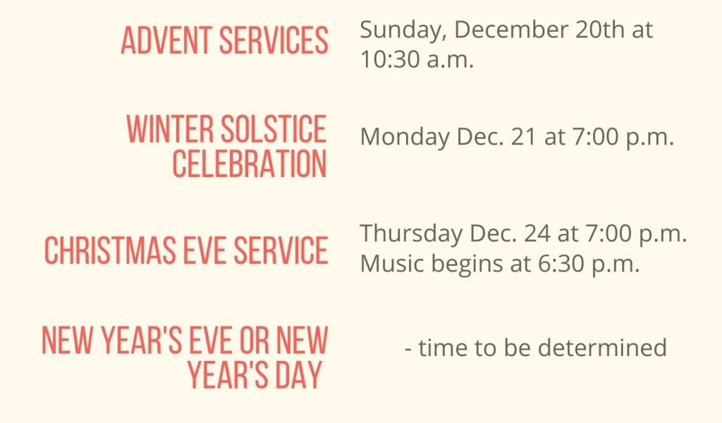Please see the details below for the Advent season. May you find needed hope, peace, joy, and love this season!