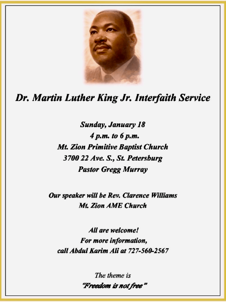 Join in on one of the nation’s largest celebrations of Dr. King! Watch the parade going through Downtown St. Pete on January 19, 2026 starting at 11 AM. For more information, go to https://www.stpetemlkparade.com/