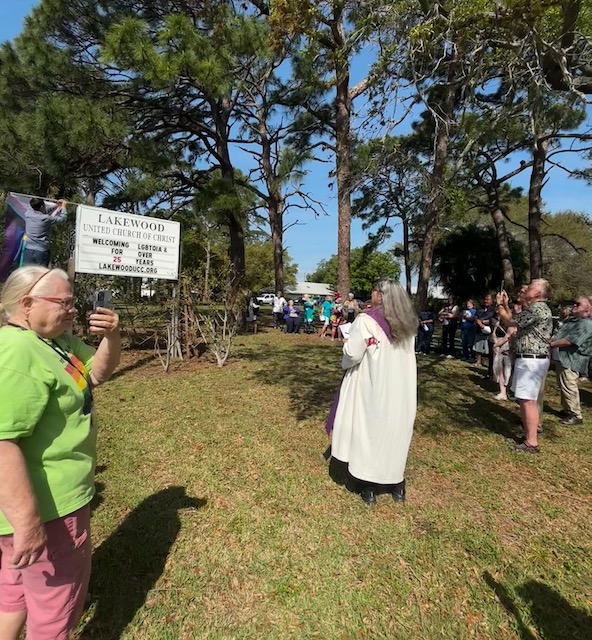 In celebration of the 25th anniversary as an Open and Affirming Church, Lakewood/Trinity United Church of Christ publicly redeclared the enthusiastic welcoming of lesbian, gay, bisexual and transgender persons into the full life and ministry of the church in today’s service. To demonstrate this wide open welcome to those who have often found church to be a hostile and hurtful place, a gay pride/transgender flag was raised on the church grounds. Metro Inclusive Health and Equality Florida also gave presentations on their work in our community as part of this special commemoration. Many thanks to all who attended this important event and a special thanks to the Outreach Committee for all that was done to make it happen!