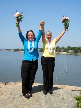 Previous Image Next Image Celebrating on the rock following ceremony. Scene looks out toward Long Island Sound.