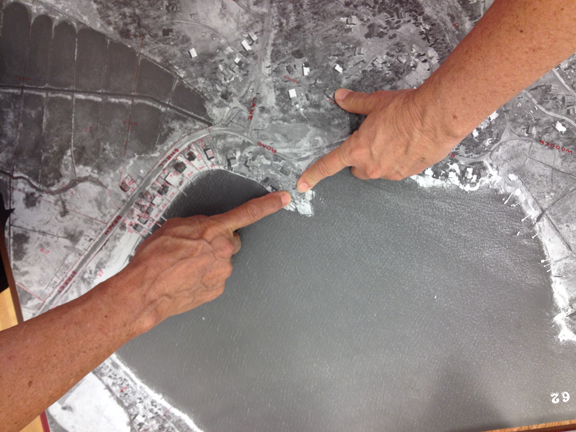 Pointing to the spot on an old aerial map at the Guilford town library.